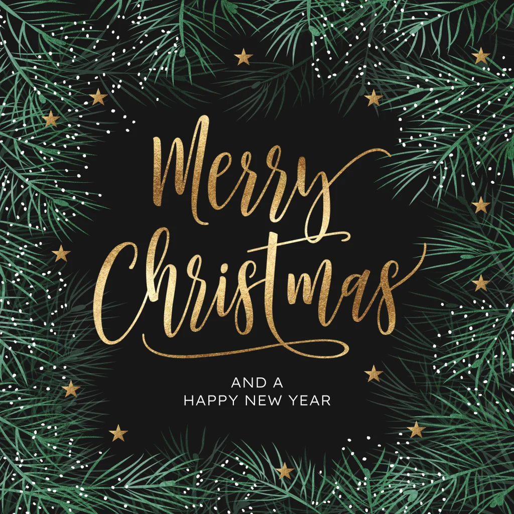 Mooie kerstkaart met kerstboom takken rondom en kleine witte lichtjes. En grote gouden typografische design: Merry Christmas.