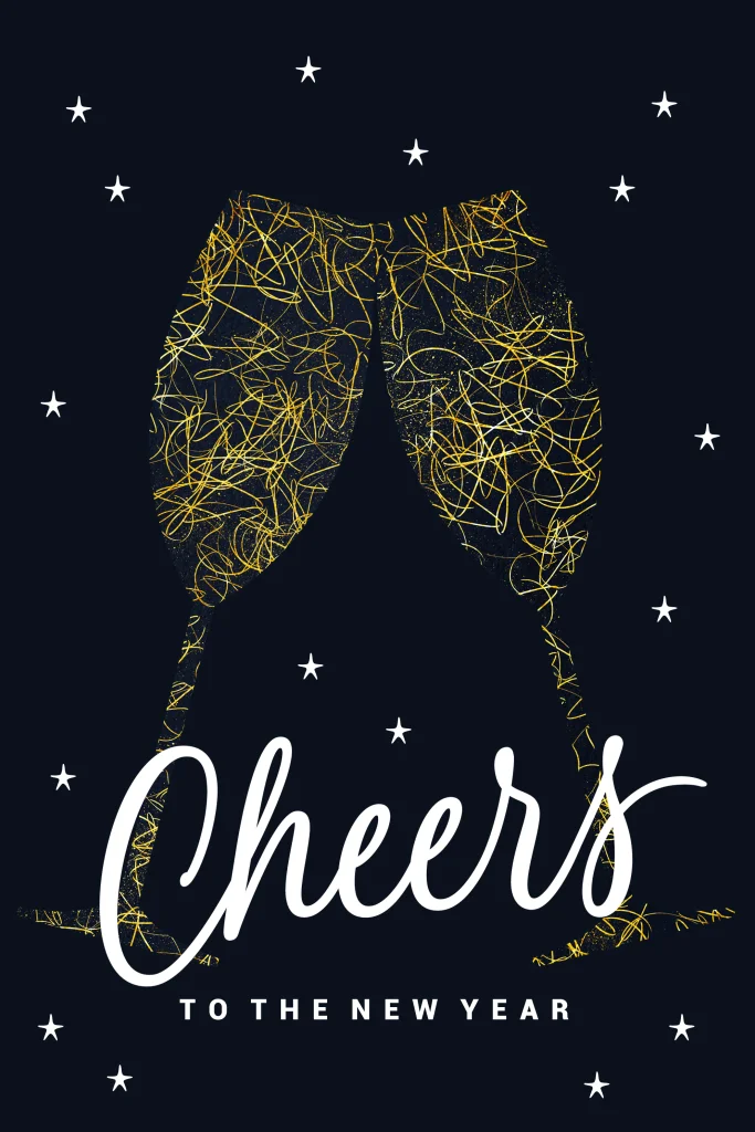 Chique nieuwjaarskaart met illustratie van champagne glazen met witte typografie "Cheers".