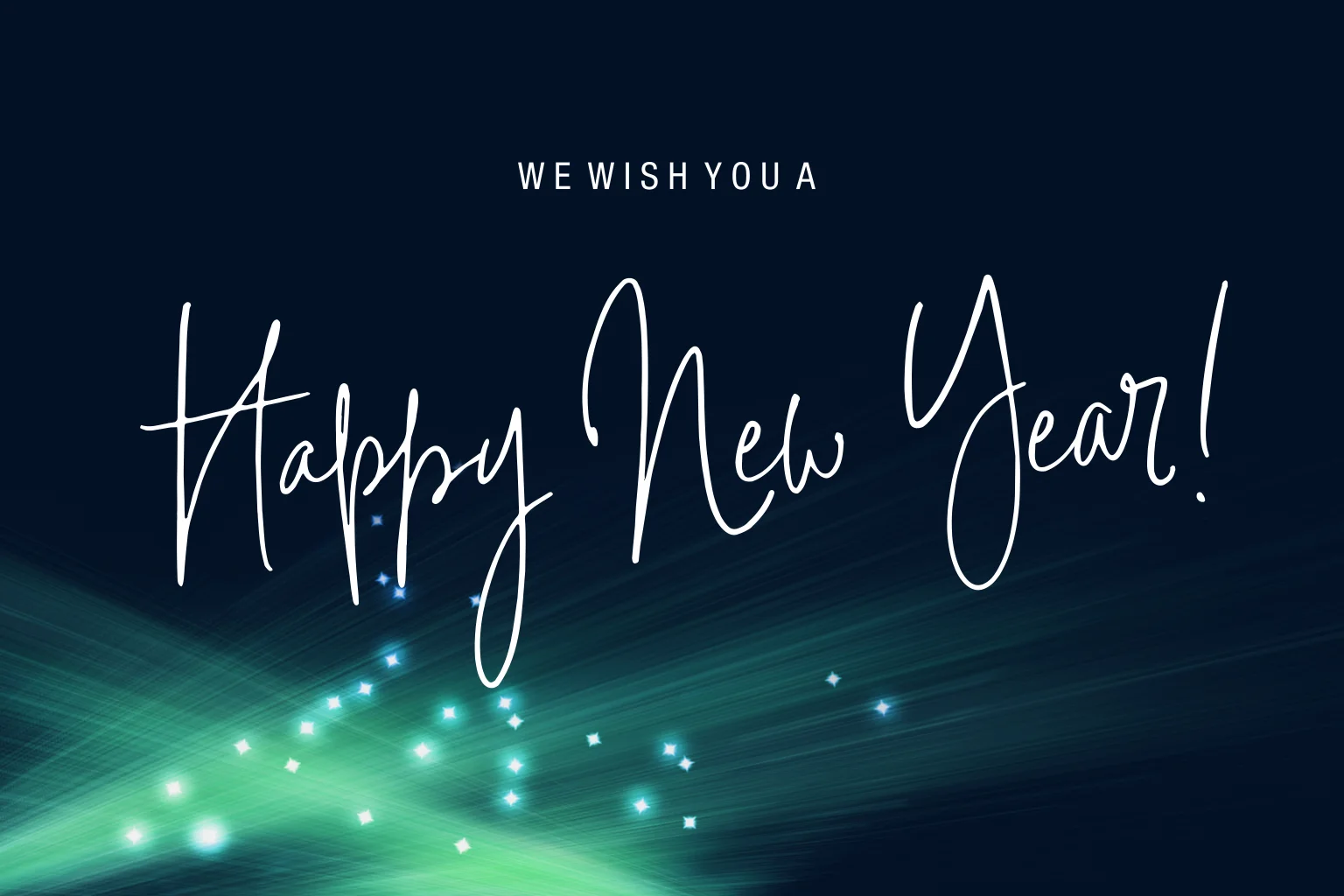 Wens iedereen een gelukkig nieuwjaar met deze mooie nieuwjaarskaarten met Happy New Year op de voorkant en mooie groene lichtstralen en kleine fonkelende lichtjes.