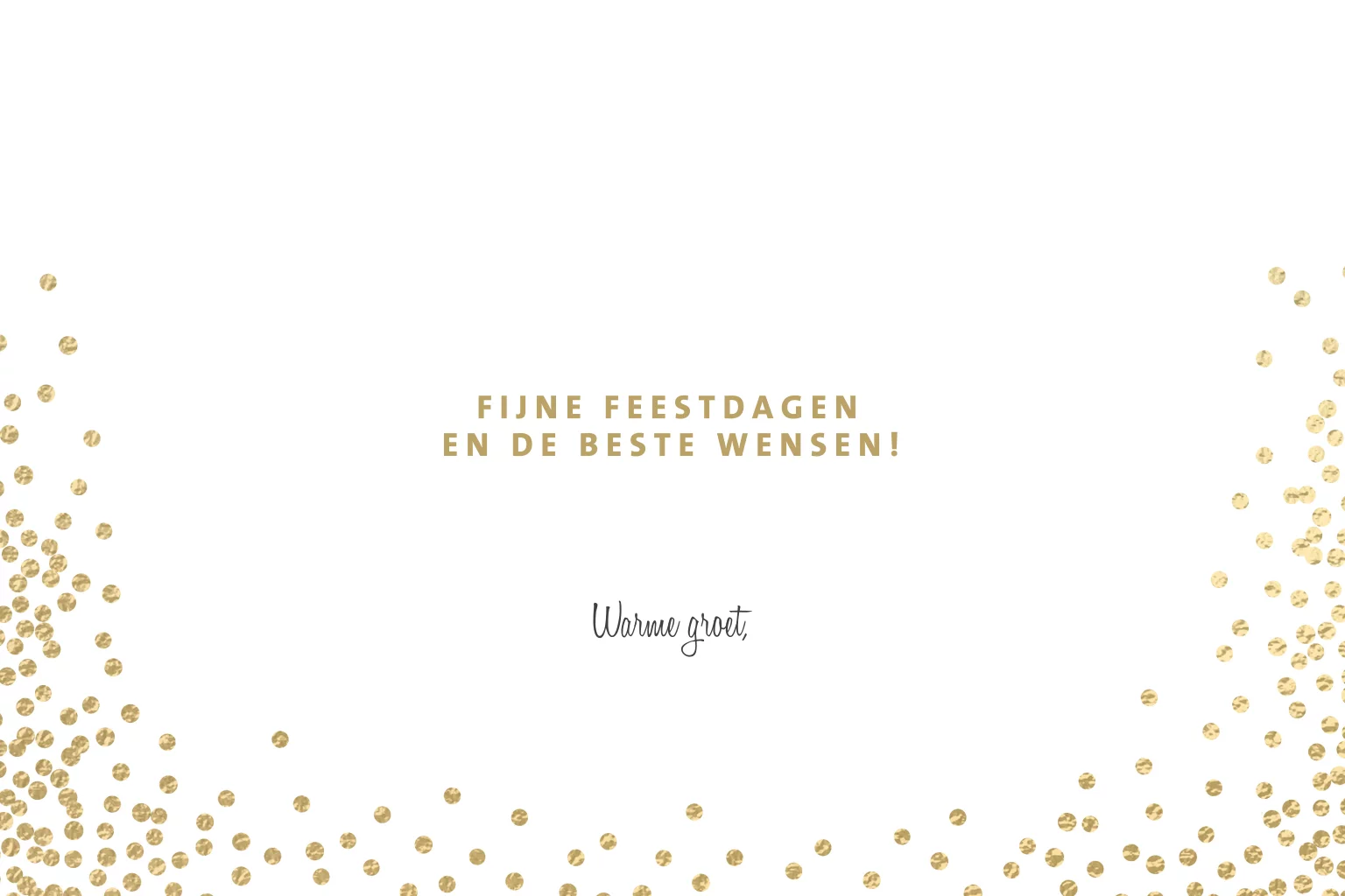 De nieuwjaarskaart heeft feestelijke vallende winterse sneeuw rondom jullie eigen foto en gouden confetti en gouden teksten aan de binnenkant.