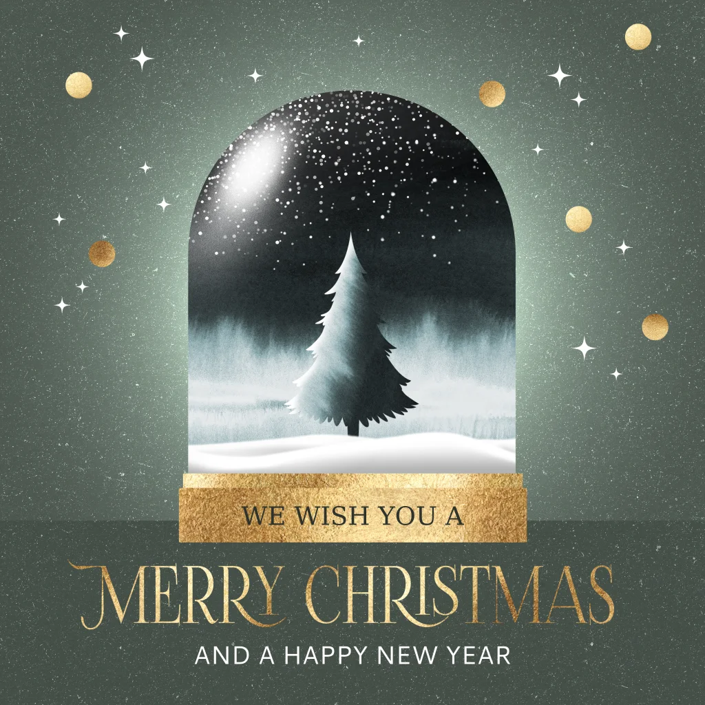 Verstuur deze originele kerstkaarten met een illustratie van een mooie sneeuwbol met daarin een besneeuwde kerstboom en winterlandschap en een groene achtergrond met goud Engelse kerstwens. (Geen goudinkt)