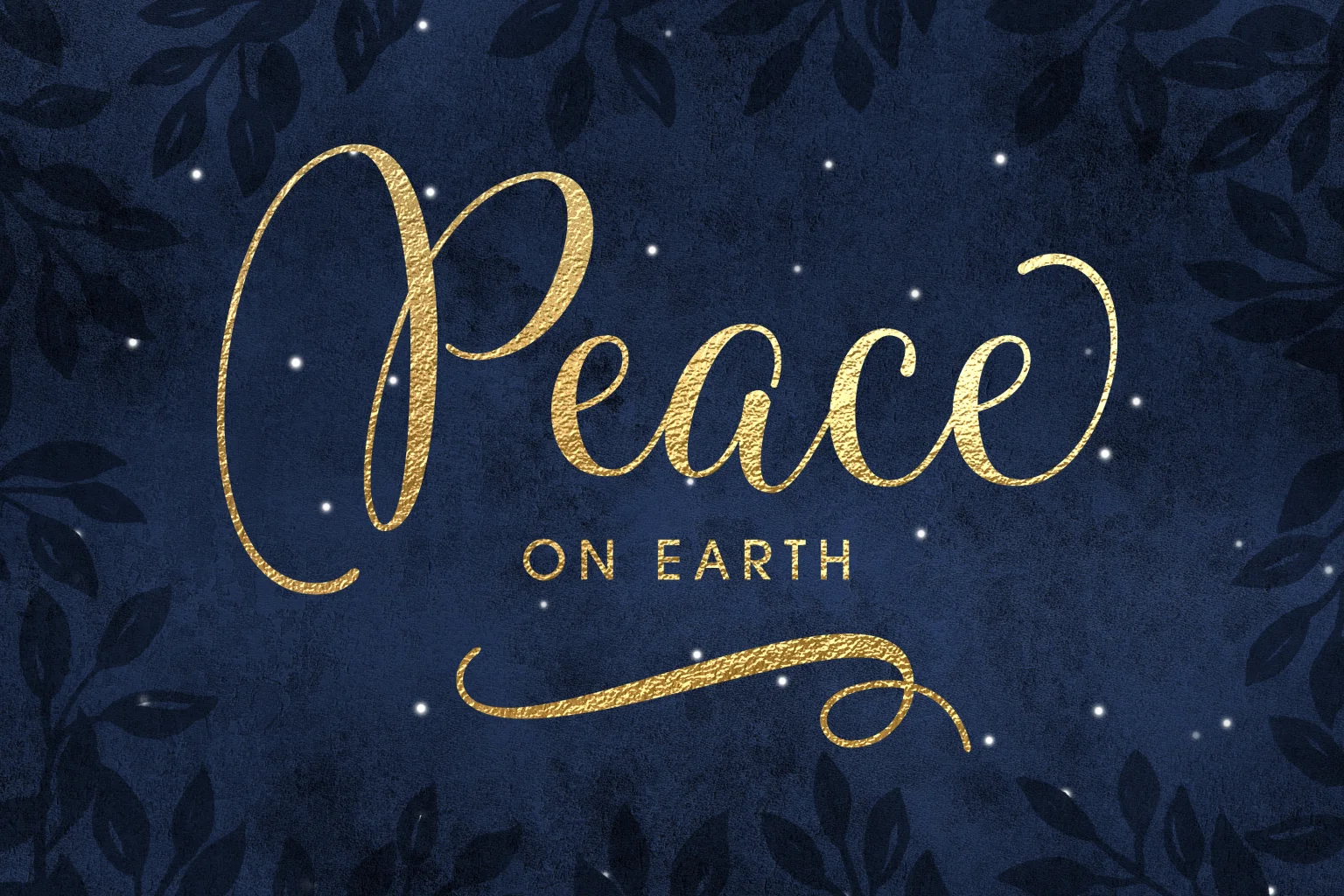 Mooie kerstkaart met typografische gouden tekst "Peace on Earth" op een donker blauwe sterren hemel met zwarte botanische mistletoe bladeren rondom.