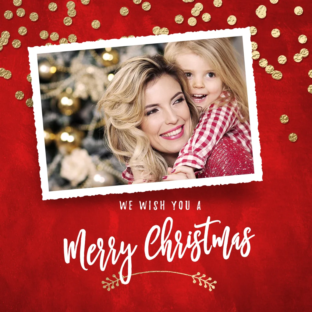 Verras al je familie en vrienden met deze feestelijke rode kerstkaart met foto van je gezin op de voorkant. De mooie rode achtergrond met gouden confetti laten de foto echt uit de kaart springen. De kerstwens "Merry Christmas" maakt de voorkant compleet.