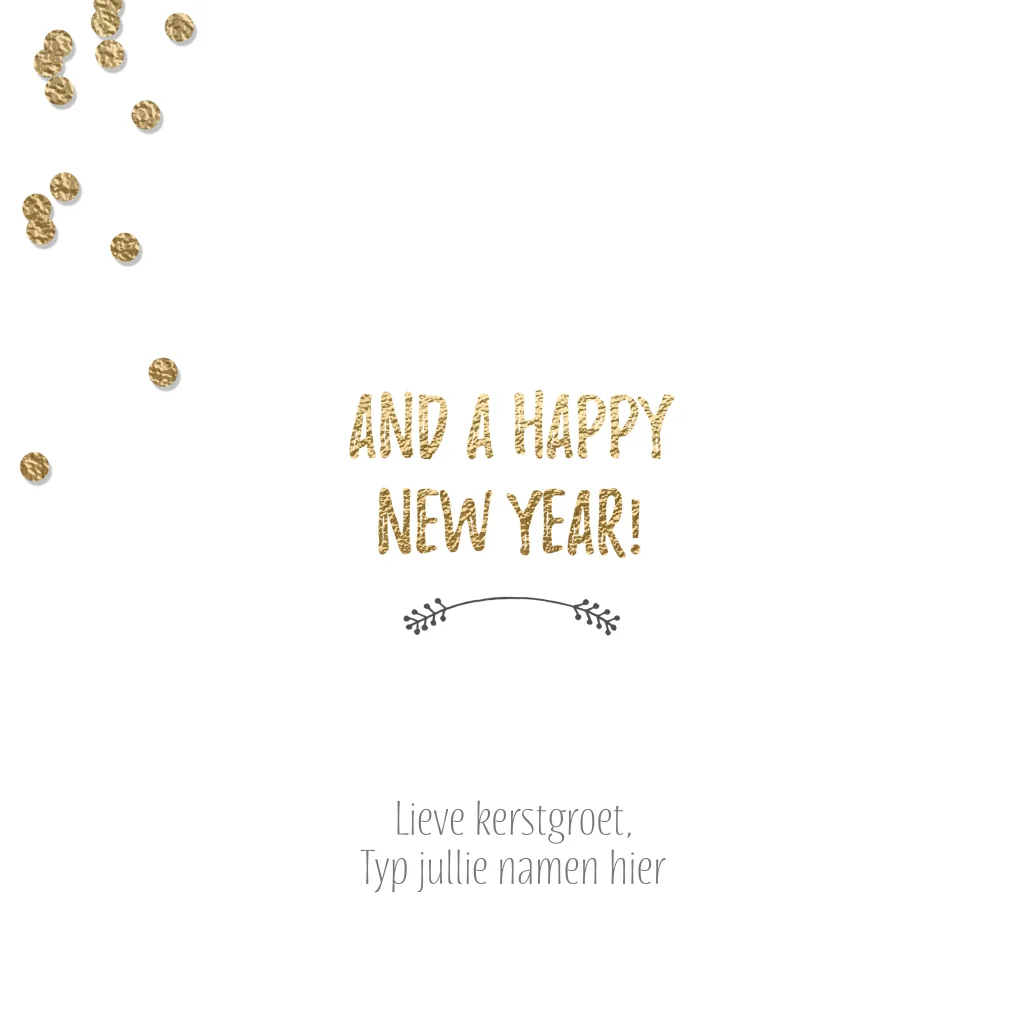 Aan de rechter binnenzijde van de kaart staat in gouden letters "And a Happy New Year!". Hieronder kunnen jullie de namen van het gezin plaatsen of een leuke tekst of kerstgroet. Ook is het mogelijk om leuke clipart toe te voegen.