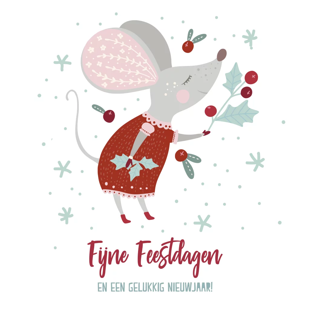 Schattige kerstkaart met een illustratie van een lieve grijze muis, met leuke kersttakjes en sneeuwvlokken rondom.