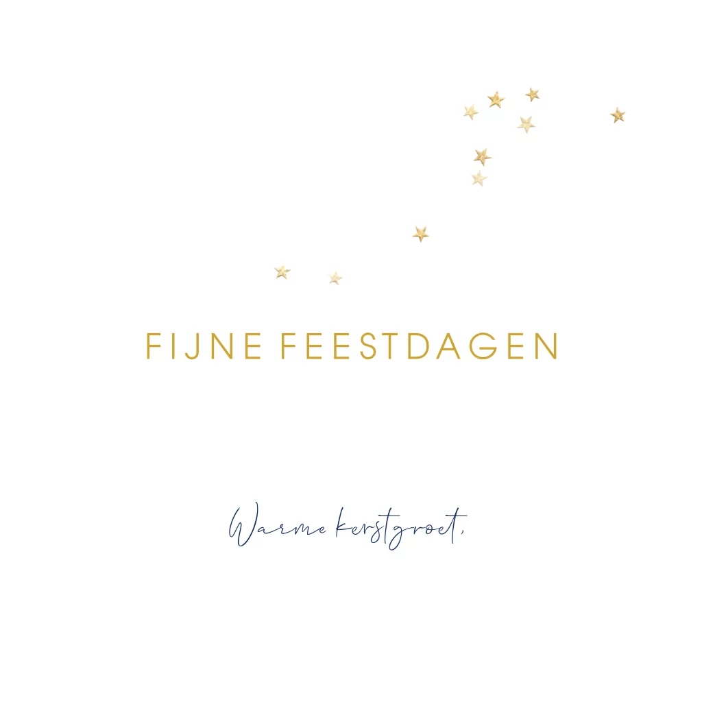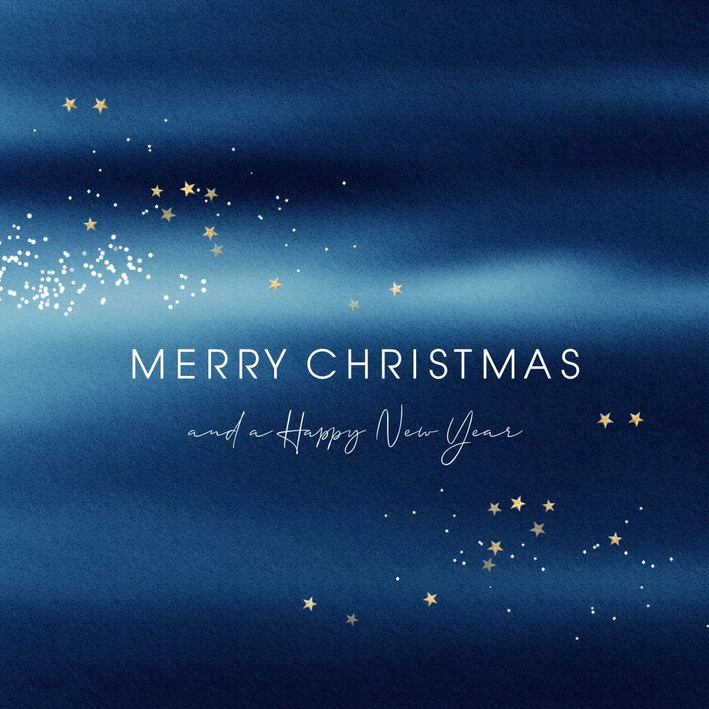 Mooie stijlvolle kerstkaart met een blauwe hemel en kleine lichtjes en sterretjes rondom. Alles op deze kerstkaart is aan te passen.