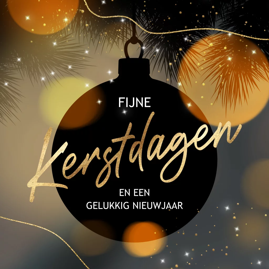 Personaliseer en bestel nu deze stijlvolle kerstkaarten met betoverende kerstballen in gele en zwarte kleuren met rondom kleine lichtpuntjes!