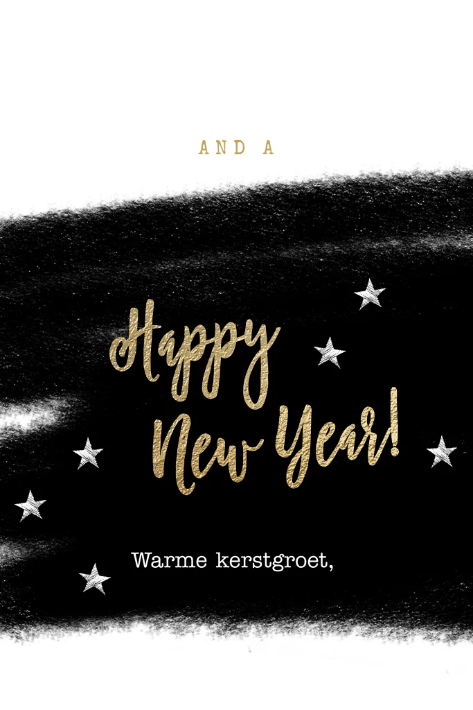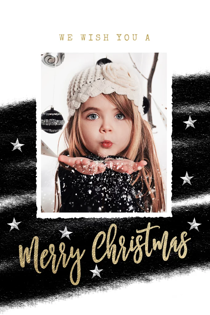 Trendy zwart-witte kerstkaart met je eigen foto op de voorkant. Met een strak witte achtergrond en mooie zwarte verf vegen op de ondergrond. En de tekst "We wish you a Merry Christmas" in het goud aan de voorkant en "Happy New Year" aan de binnenkant.