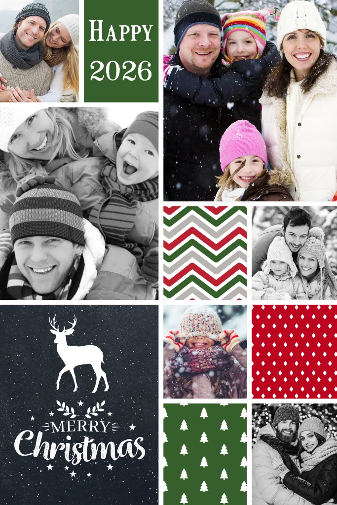 Maak zelf deze vrolijke fotocollage kerstkaart voor 2026 waar je 6 eigen foto's in kan zetten.