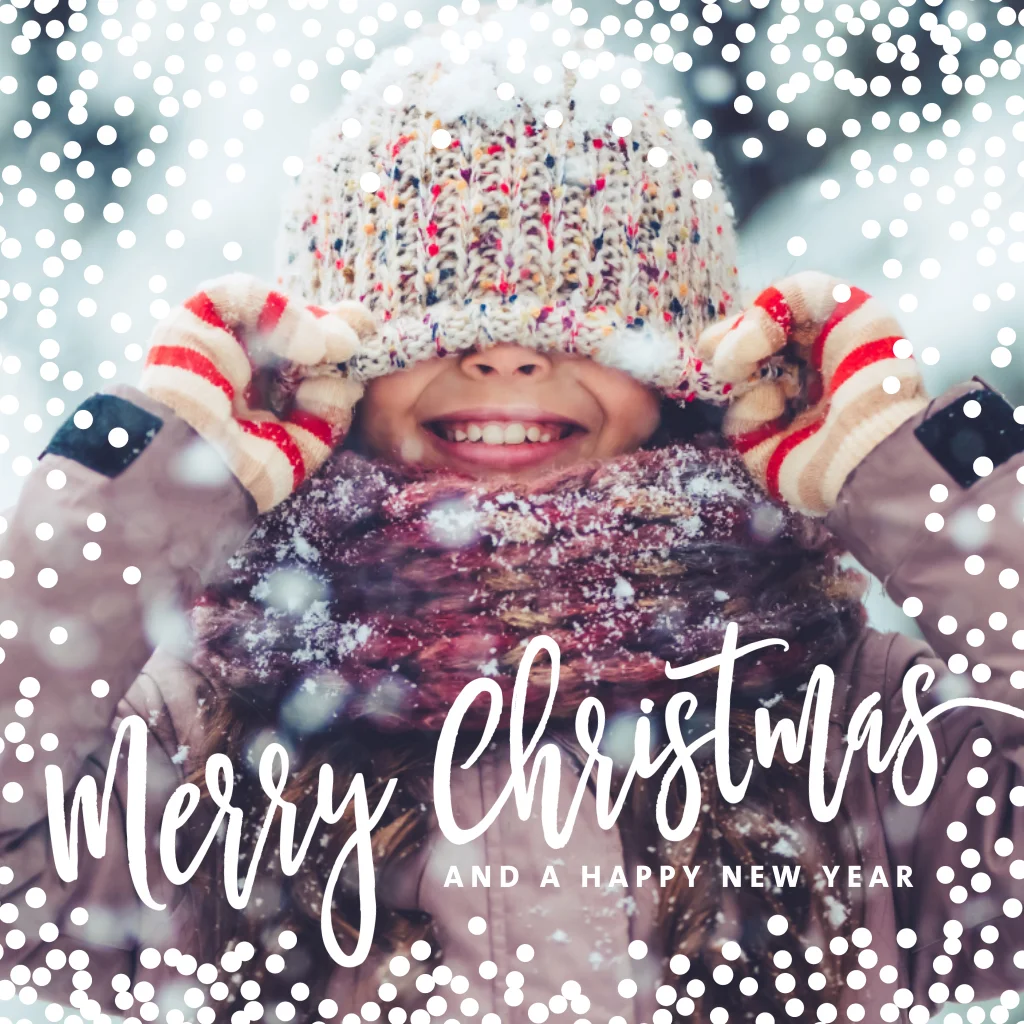Een leuke winterse kerstkaart die je zelf kan maken met je eigen foto op de voorkant en leuke witte sneeuwvlokjes rondom. Met lichtblauwe binnenkant en hippe typografische "Merry Christmas and a Happy New Year" teksten.