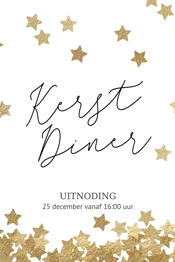 Mooie uitnodigingen kerstdiner met feestelijke gouden sterren op een witte achtergrond die je zelf helemaal kan personaliseren.