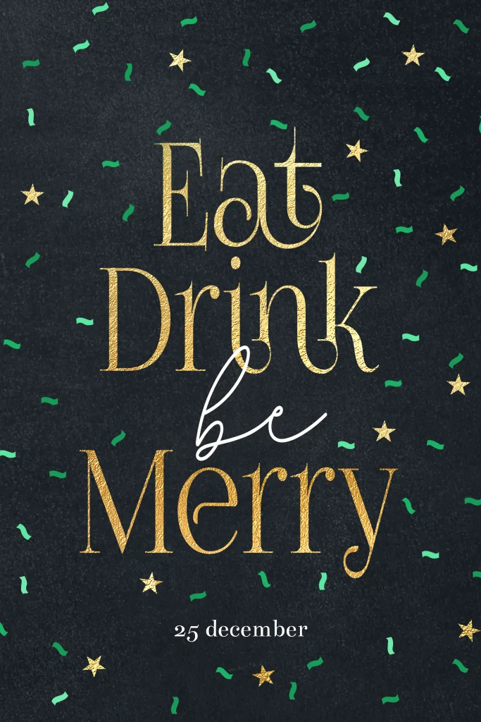 Maak zelf Deze feestelijke kerst menukaarten met je eigen gerechten op de achterzijde. Met sierlijke letters: Eat Drink be Merry. Met een hip ontwerp van groene confetti en kleine kerst sterretjes.
