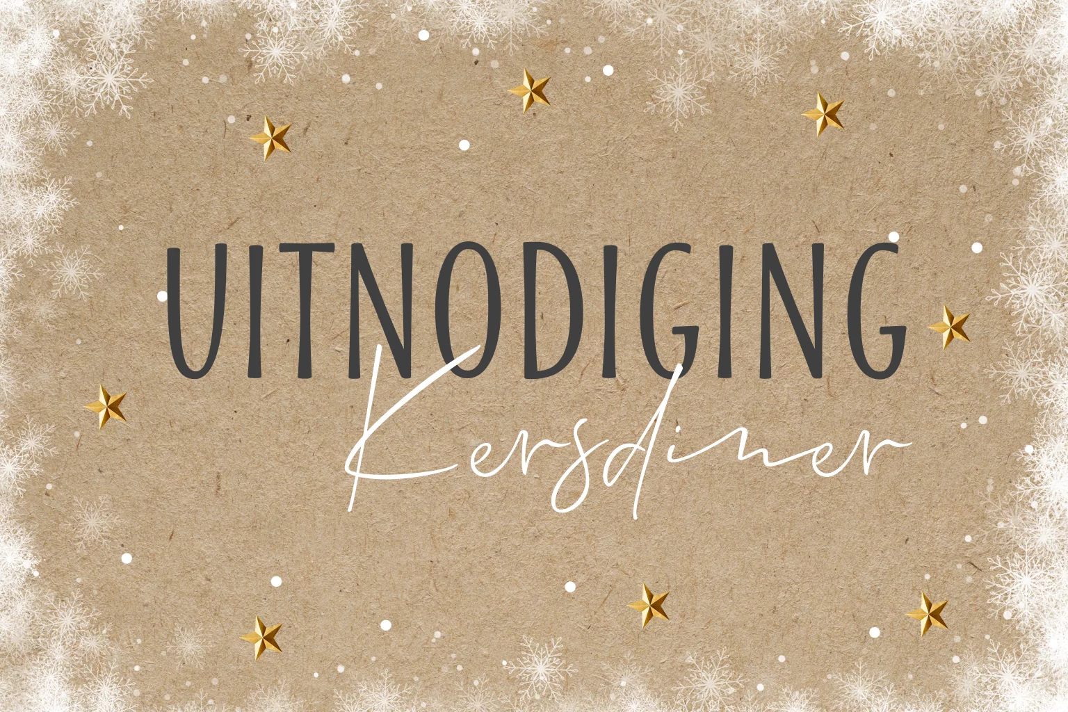 Een hippe uitnodiging voor je kerstdiner met kraft look en winterse sneeuwvlokken rondom en kleine gouden sterretjes.