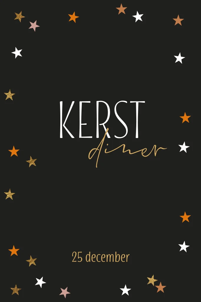 Stijlvolle kerstmenukaart die je zelf kan maken en laten bedrukken met hippe kleine sterretjes en mooie minimalistische teksten.