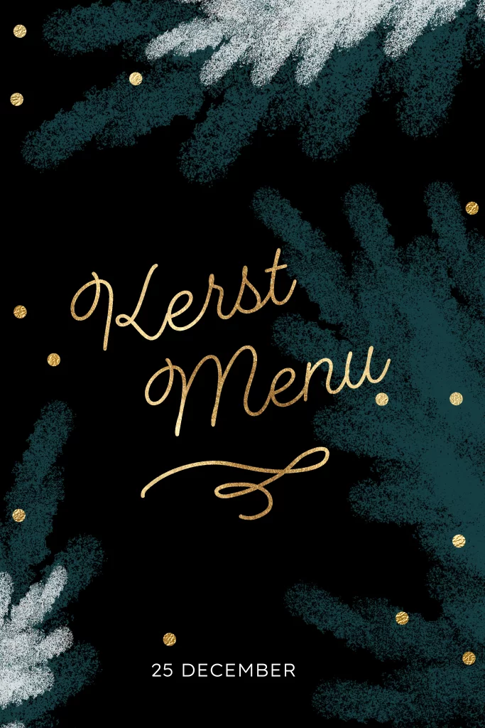 Wil je zelf een prachtige menukaart voor kerst zelf maken en personaliseren met je eigen kerstdiner gerechten? Dat kan met dit mooie design. Zet je eigen gerechten op de achterkant. Het ontwerp heeft op de voorkant chique en stijlvolle verf effecten van donker groen met zwart en hippe krijtverf takken.