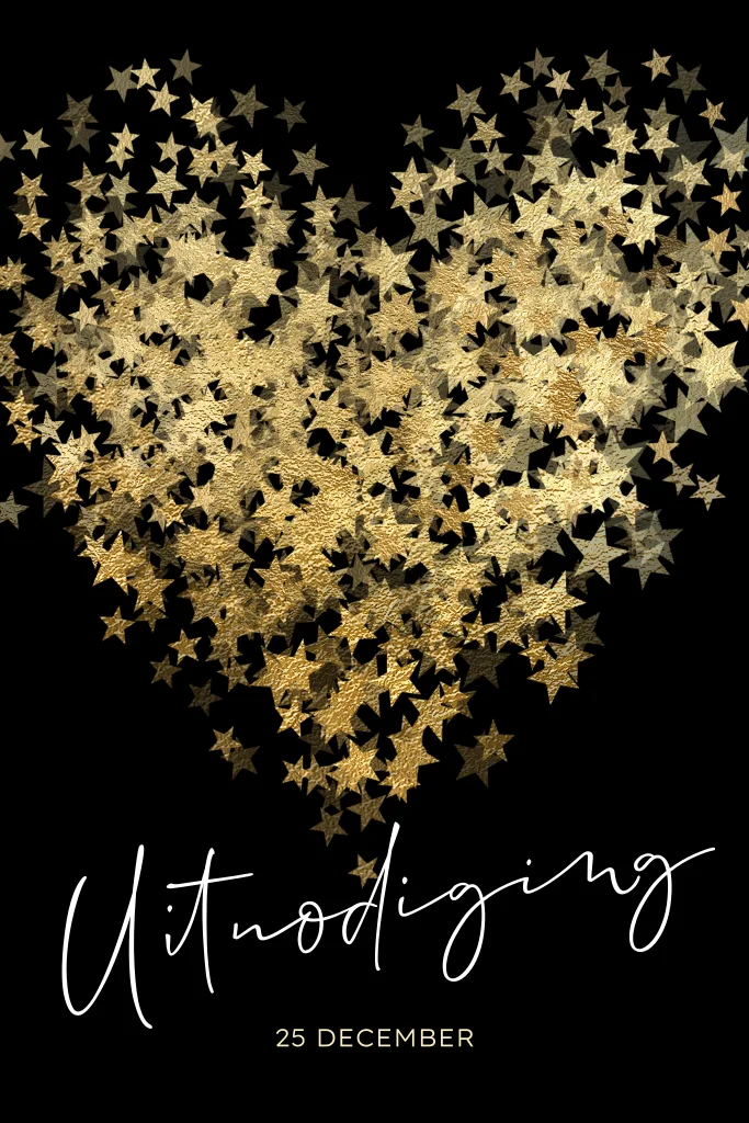 Mooie uitnodiging voor het kerstdiner of een nieuwjaarsborrel en pas alle teksten aan naar wens. Mooi ontwerp met een groot gouden hart van vele kleine sterretjes is op een zwarte achtergrond.