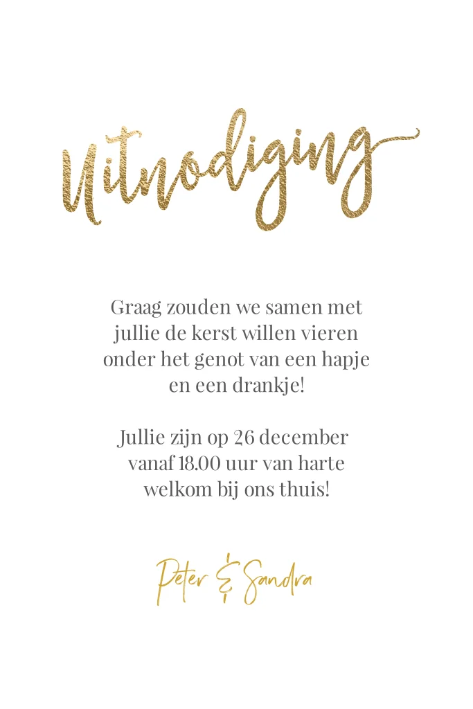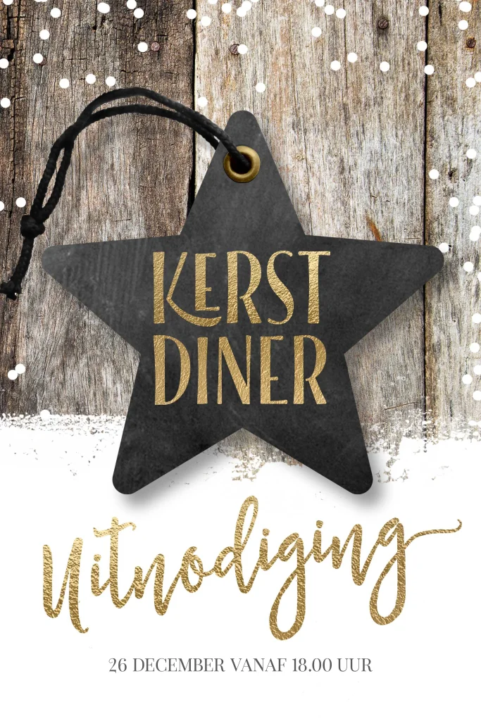 Hippe uitnodiging voor het kerstdiner met hout, sneeuw en leuke gouden typografische teksten.