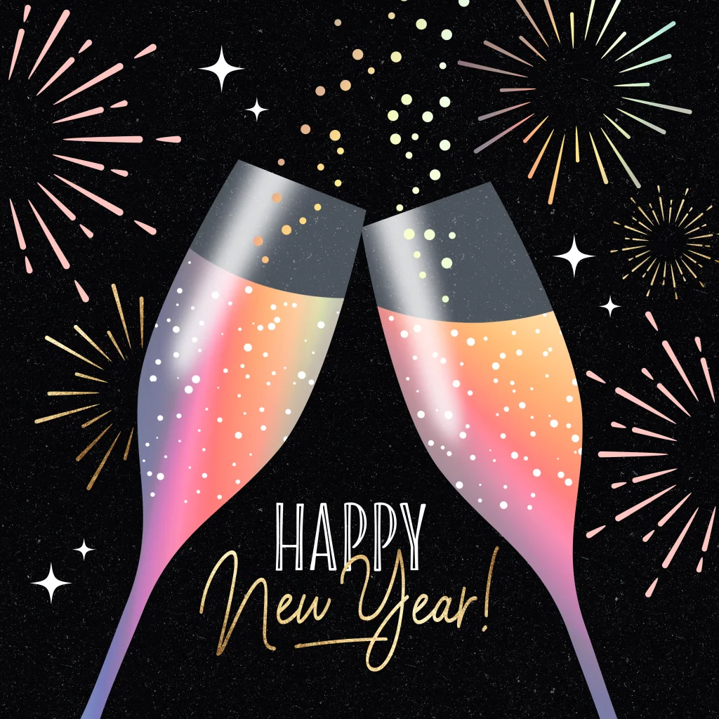 Maak en bestel deze feestelijke proostende glazen met rondom hip vuurwerk en verstuur ze naar alle vrienden, familie en zakelijke klanten.