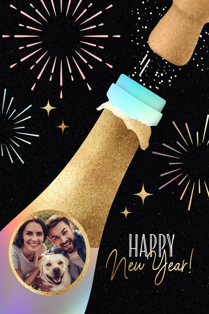 Vier het nieuwe jaar in stijl met deze feestelijke nieuwjaarskaarten met een hippe champagnefles en rondom feestelijk vuurwerk. Personaliseer deze nieuwjaarskaarten met jouw eigen foto en tekst.
