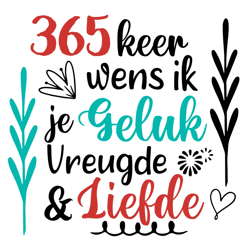 Mooie kerstkaart en nieuwjaarskaart met een lieve kerstspreuk 365 keer wens ik je geluk, vreugde & liefde. Met grote typografie in hippe turquoise blauw en retro rode kleuren en hippe versieringen rondom.