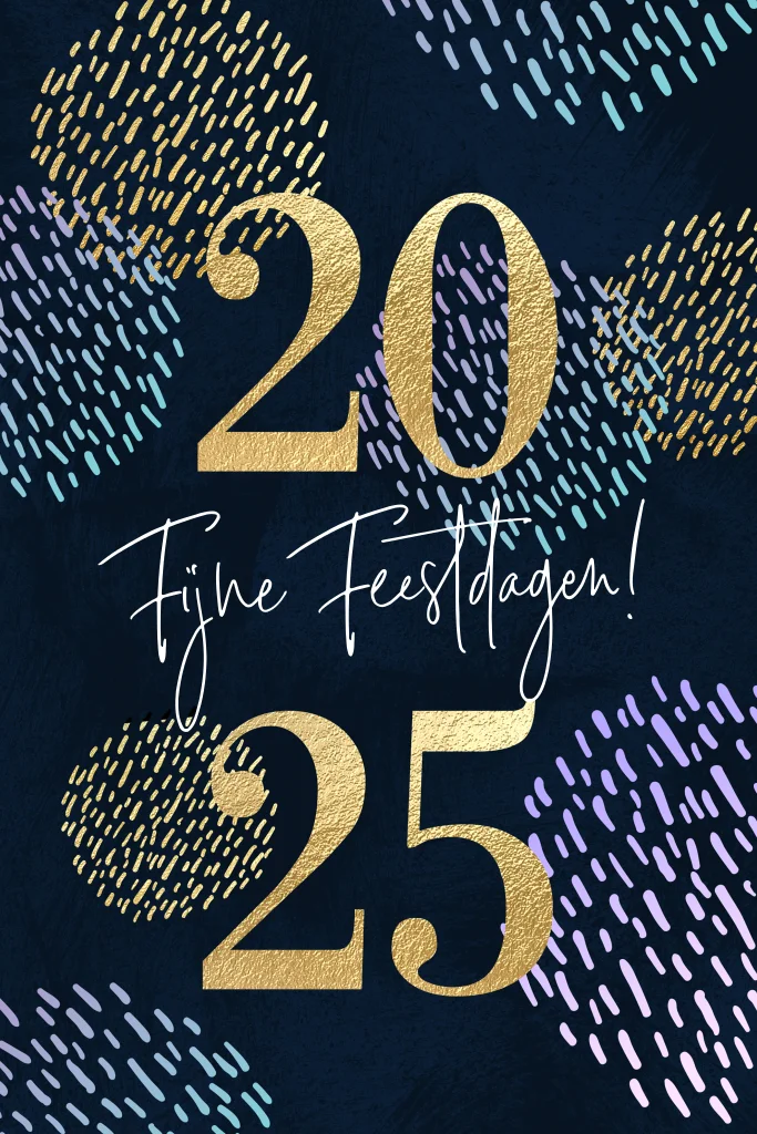 Mooie nieuwjaarskaarten voor 2024 - 2025 met mooie gestreepte bollen en stippen in goud look en paars blauwe kleuren verloop.