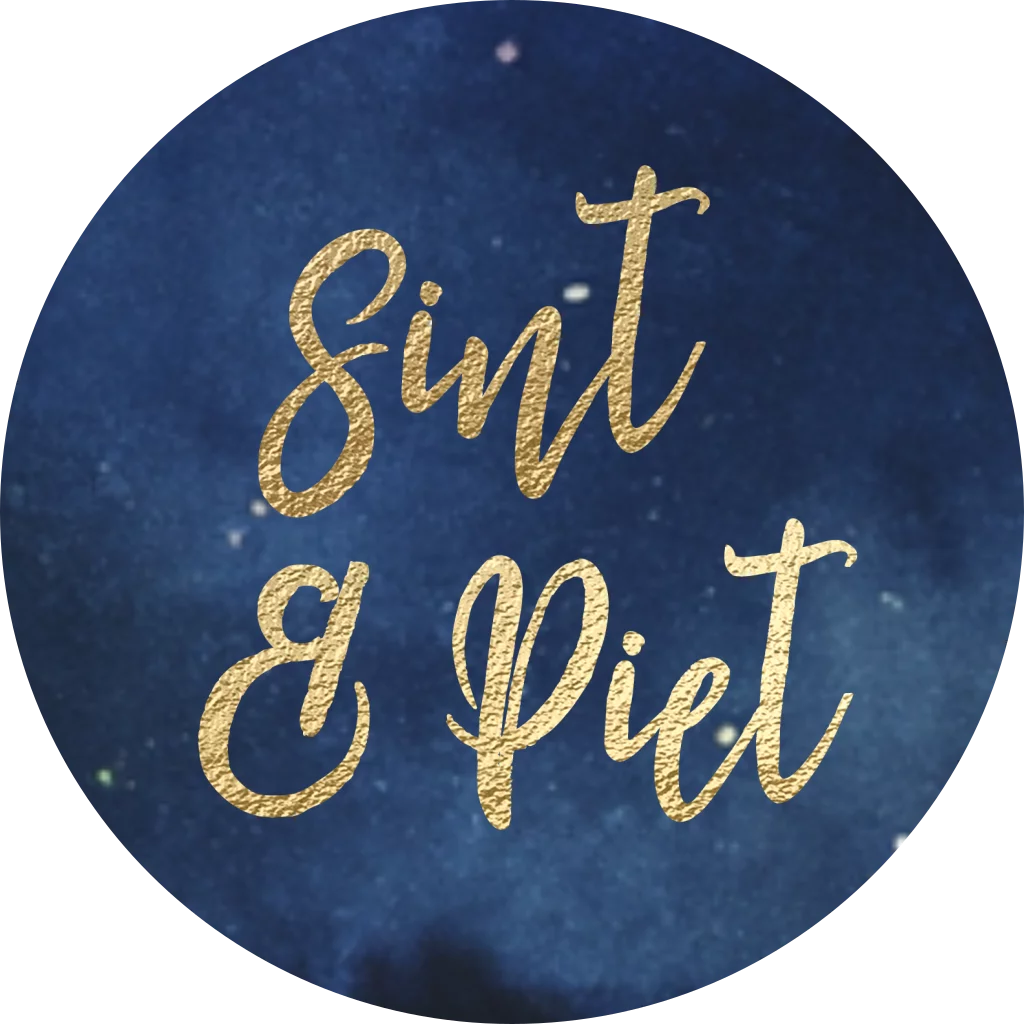 Mooie sticker met Sint en Piet in goud look op een donkere nacht. Alles op deze sticker kun je zelf personaliseren. - De sticker heeft een diameter van 35 mm. - 25 stuks per vel