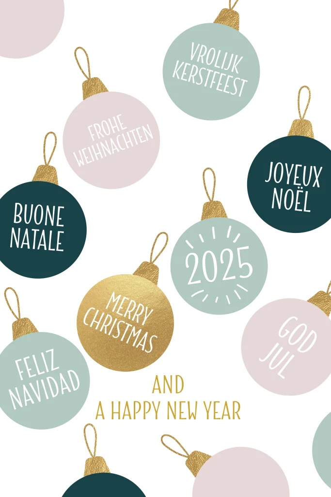 Op iedere kerstbal staat een kerstgroet in een andere taal. Vrolijk kerstfeest - Frohe weihnachten - Feliz navidad - Merry Christmas - Joyeux Noël - Buone Natale - God Jul en het jaar 2025.