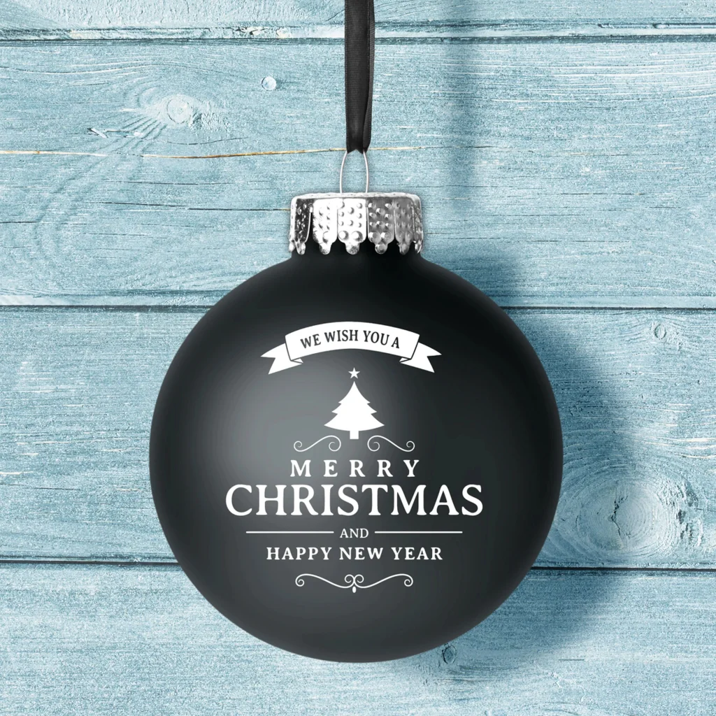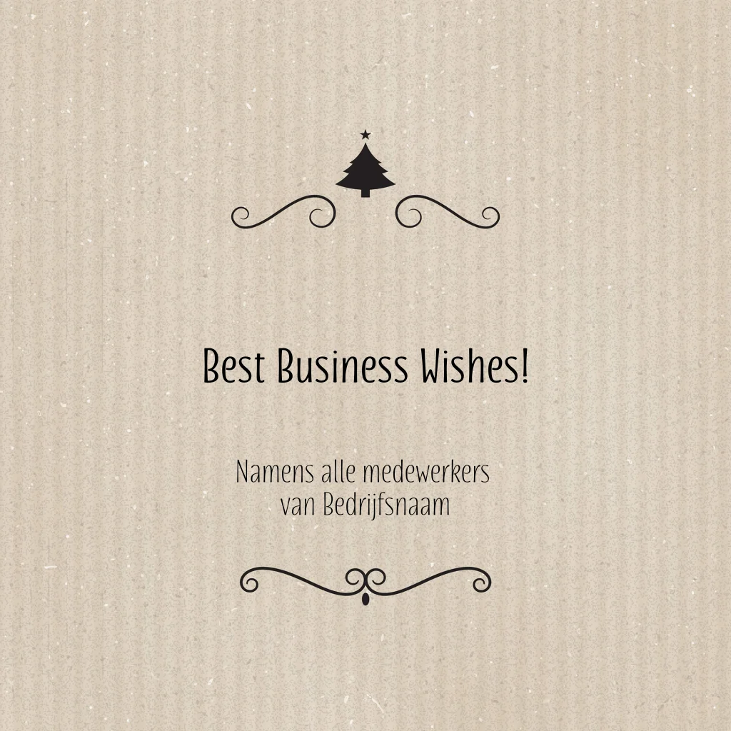 Mooie zakelijke bedrijfs kerstkaart met een kerstbal om te versturen naar alle zakelijke klanten. Met een blauwe houten ondergrond en een grote zwarte kerstbal met een kerstwens op de voorkant.