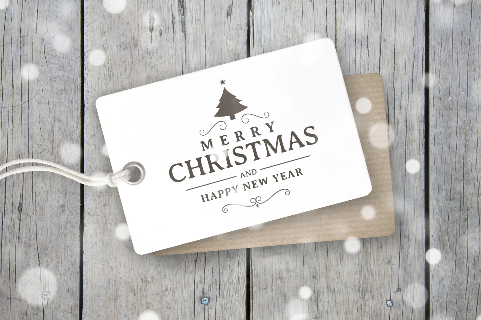 Moderne business kerstkaart op een achtergrond van hout met sneeuwvlokken en mooi zakelijk label. Strakke business kerstkaart van Luckz.