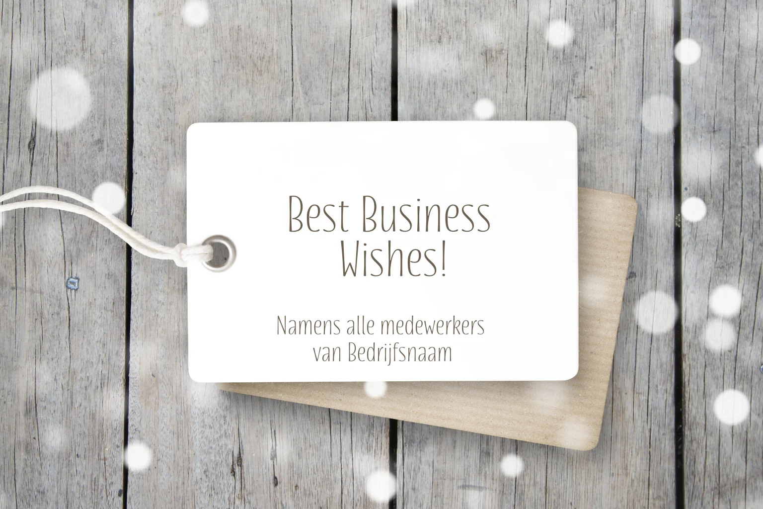Deze winterse zakelijke kerstkaart heeft een mooi hout structuur look, vallende sneeuwvlokken en een wit label van karton. Met deze moderne kerstkaart wens je alle zakelijke contacten een mooie kerst en een succesvol nieuwjaar toe.