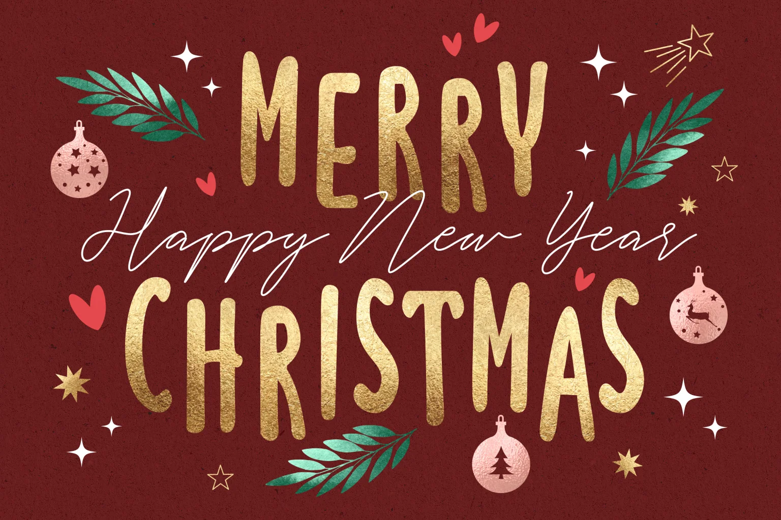 Mooie zakelijke internationale kerstkaart met een diep rode ondergrond, sierlijke vrolijke kerst illustraties en gouden Engelse tekst 'Merry Christmas'.