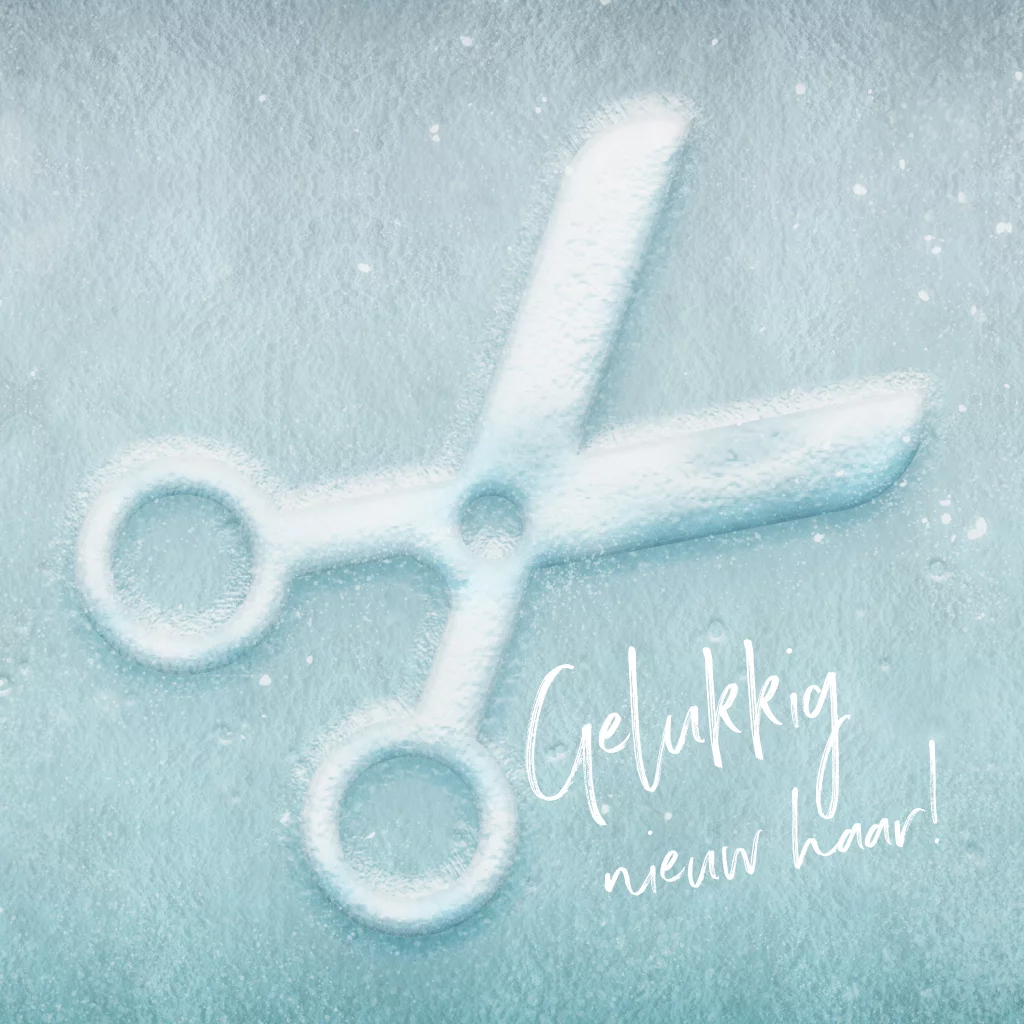 Leuke kerstkaarten voor kappers om te versturen naar alle klanten, met een schaar in de sneeuw en een aanpasbare tekst: Gelukkig nieuw haar! Alles kun je zelf aanpassen.