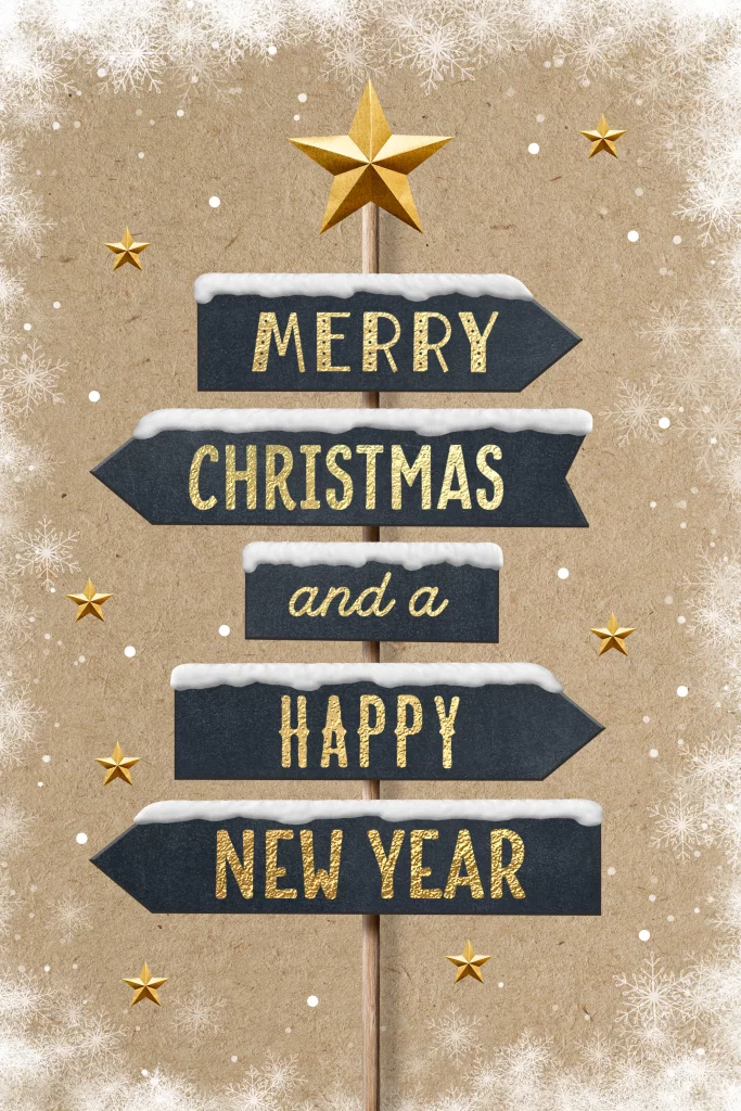 Mooie kerstkaart met een hippe kerst wegwijzer, iedere pijl wijst een kant op met de teksten: Merry Christmas and a Happy New Year!