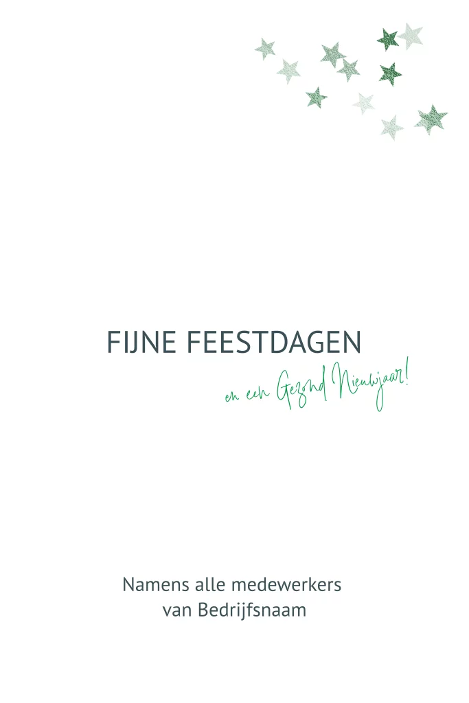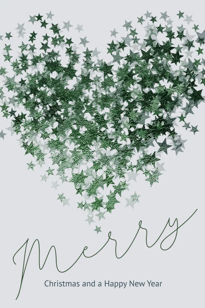 Mooie kerstkaarten voor de zakelijk markt met een groot hart ontworpen met mooie groene sterren. Zet het logo van uw bedrijf en de bedrijfsnaam in de binnenkant van de kerstkaart.