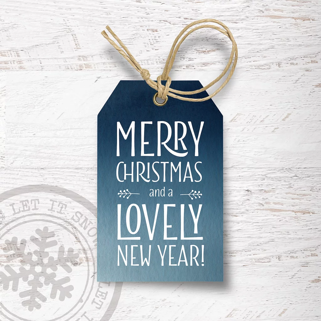 Kerstkaarten met blauw label wit hout