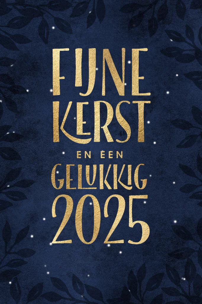 Stijlvolle kerstkaart met gouden typografische kerstwens "Fijne kerst en een gelukkig 2025".