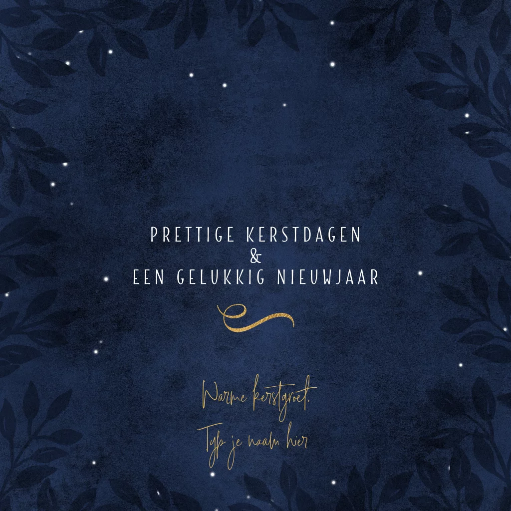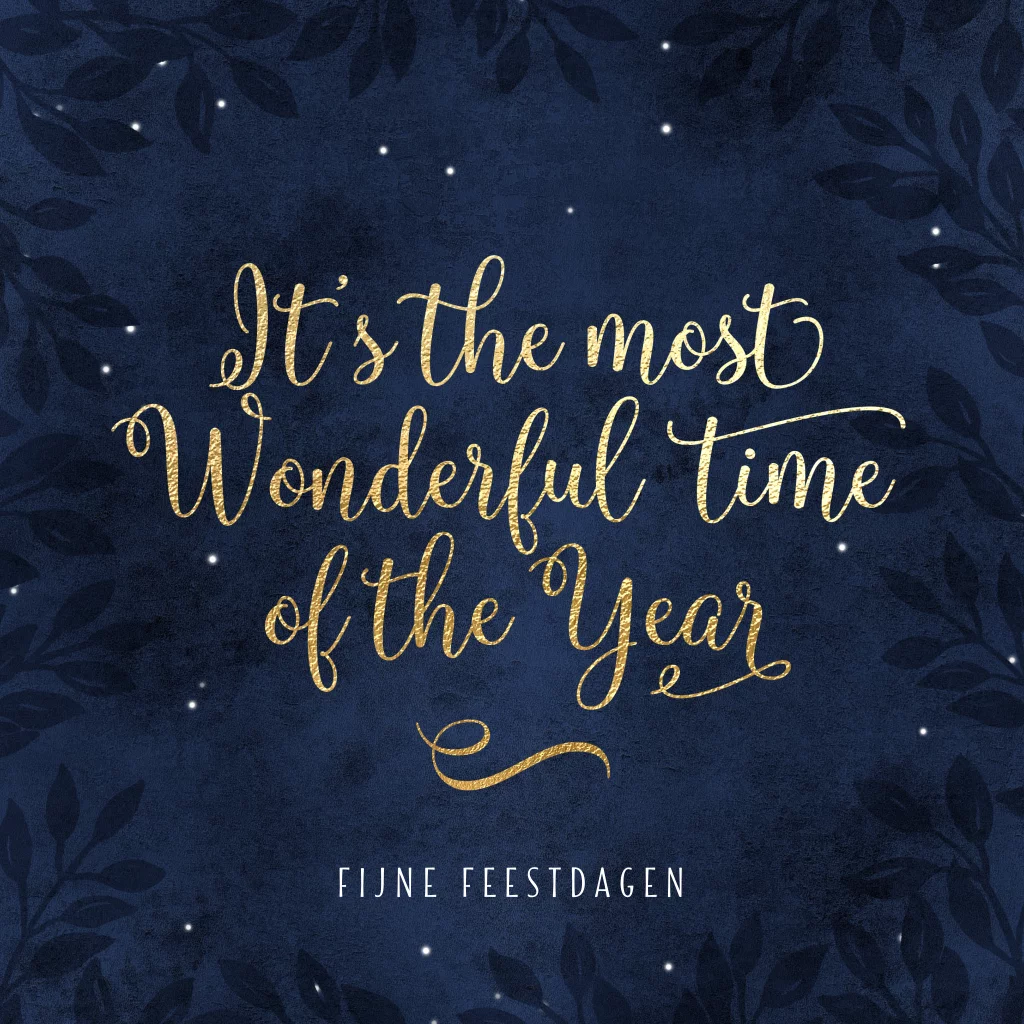Stijlvolle Kerstkaart met leuke gouden typografische Engelse kersttekst "It's the most wonderful time of the year" op een botanische donker blauwe nacht ondergrond.
