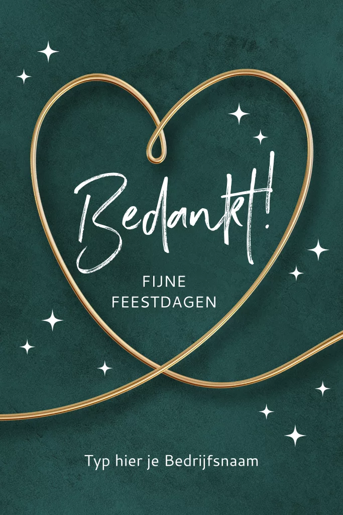 Bedank je medewerkers voor hun inzet in het afgelopen jaar met deze stijlvolle groen kleurige kerstkaart met 'bedankt', kleine sterretjes en een mooi hart. Dit is een enkele bedankkaart.