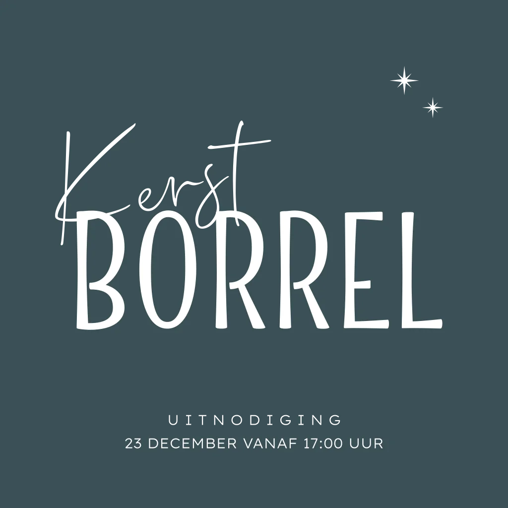 Stijlvolle uitnodiging voor een kerstborrel met mooi minimalistisch ontwerp met donkergroene kleur en écht goudfolie teksten en kleine sterren rondom.