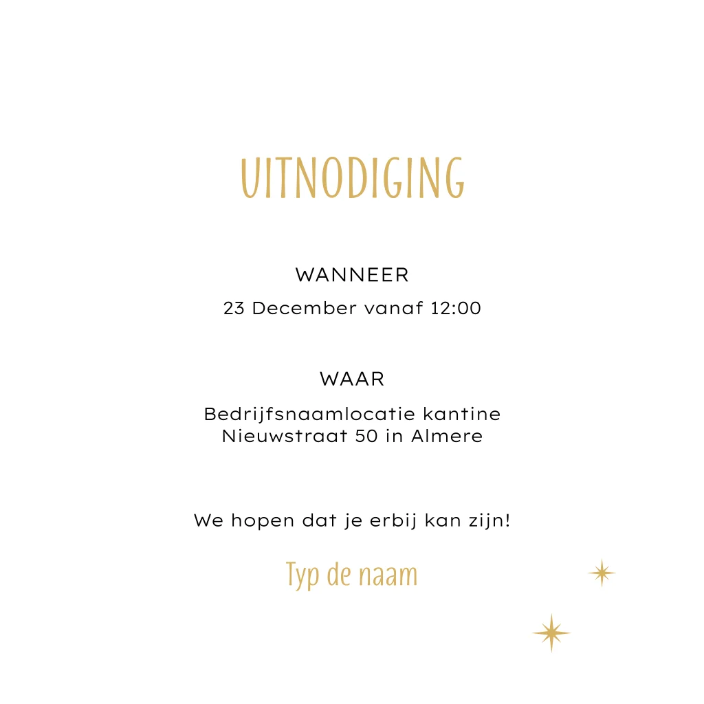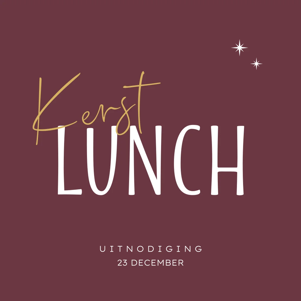 Mooie uitnodiging voor de kerstlunch met mooi minimalistisch ontwerp van donkerrode kleur en kleine sterren. Alles op deze kerstlunch uitnodiging kun je zelf personaliseren, kleuren, teksten en versieringen.