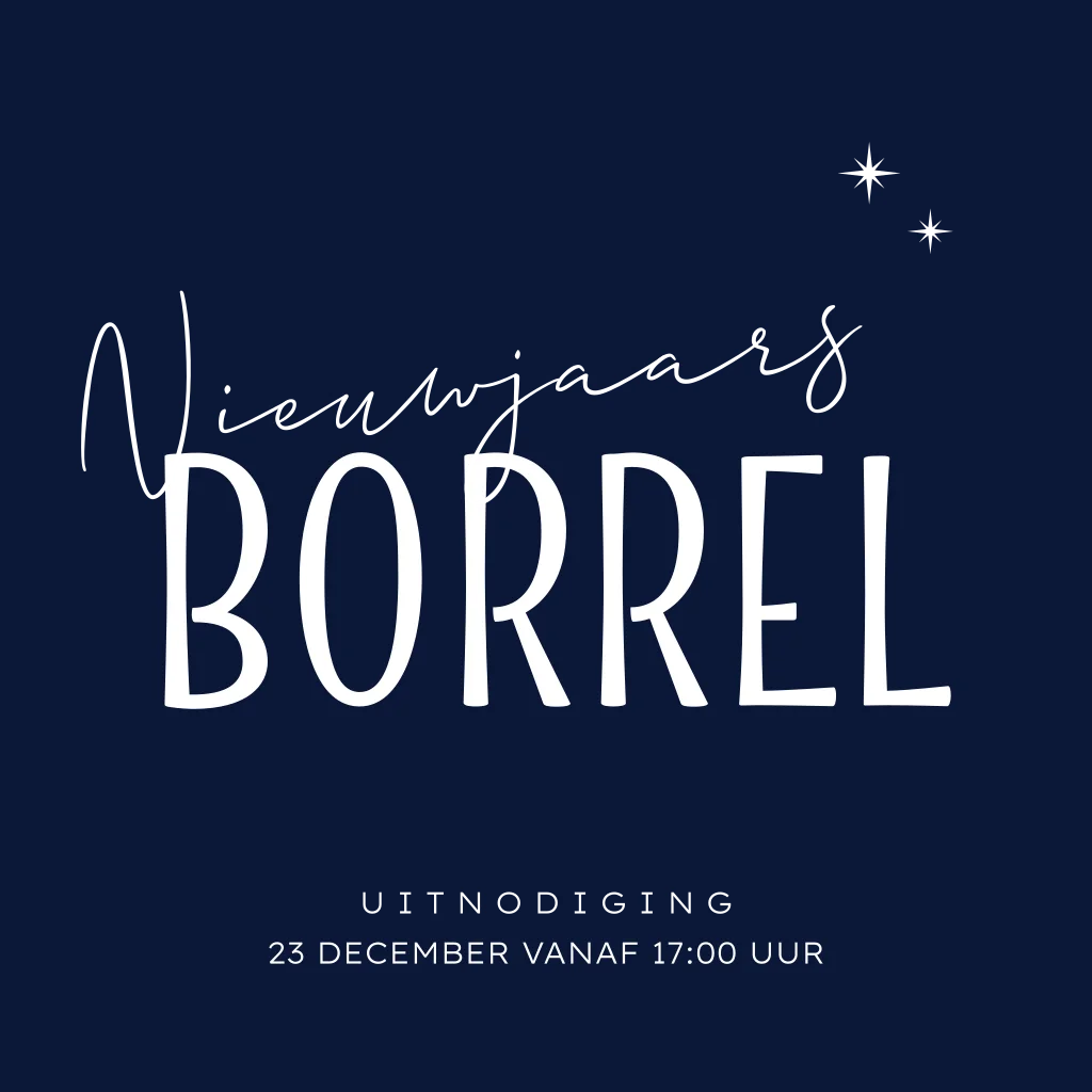 Chique uitnodiging voor een nieuwjaarsborrel met een mooi minimalistisch ontwerp van donkerblauwe kleur en écht goudfolie teksten met kleine sterren.