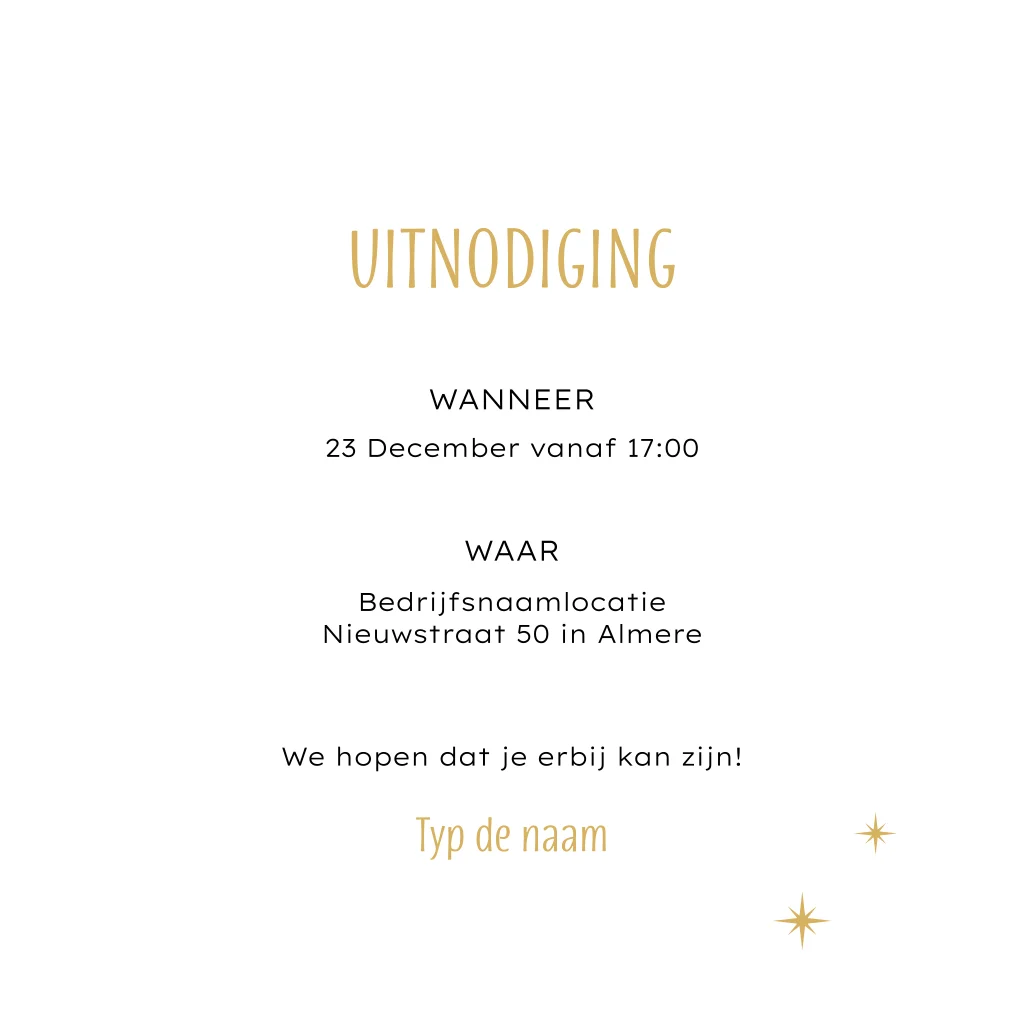Alles op deze nieuwjaarsborrel uitnodiging kun je zelf personaliseren, het is ook mogelijk om de goudfolie kleur uit te zetten. Zet een bedrijfslogo in de binnenkant om een mooie uitnodiging te maken voor de zakelijke klanten of medewerkers.