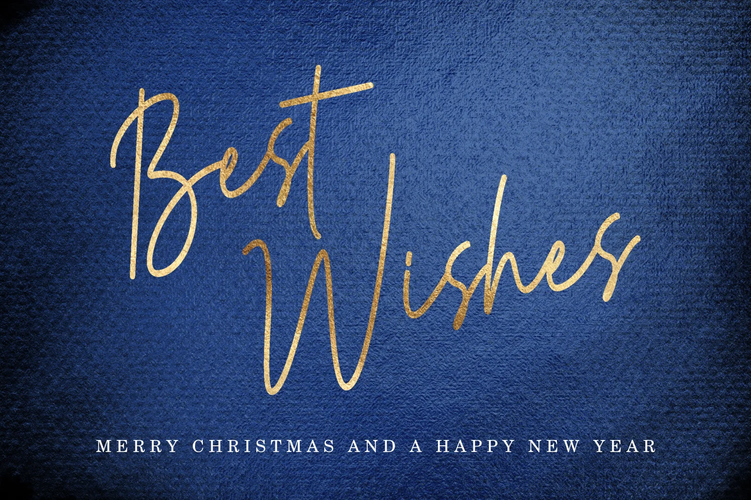 Mooie zakelijke kerstkaarten voor bedrijven die je zelf geheel kan personaliseren. Met stijlvolle donkerblauwe kleuren en goud look kerstwens: Best Wishes. Zet de zakelijke kerstwens, namen van de medewerkers of een logo in de binnenzijde.