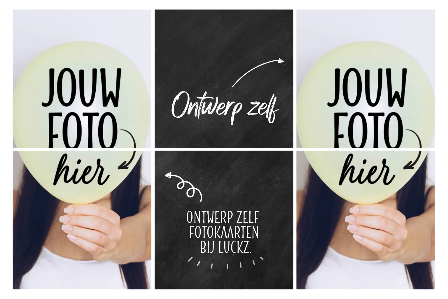 Maak zelf deze collage fotokaart met krijtbord look en 2 foto’s die je gemakkelijk zelf kan personaliseren bij Luckz. Hippe enkel liggende fotokaart met krijtbord look en twee eigen foto's. Schrijf een leuk bericht en voeg zelf versiering toe.