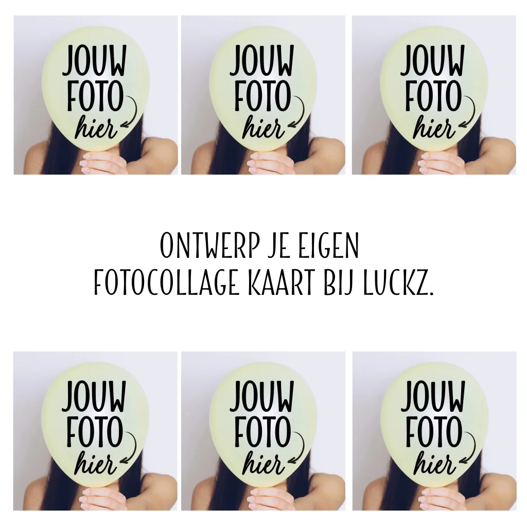 Geef jouw uitnodigingen de ultieme persoonlijke look met zes van je leukste eigen foto’s. Maak zelf deze hippe 6 foto's collage kaart, met drie foto's boven en onder op een rij en daartussen je eigen persoonlijk geschreven teksten.