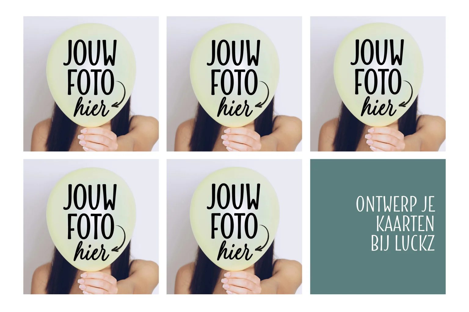 Maak makkelijk een collage fotokaart met je eigen foto's, eigen tekst en creatieve versieringen. Enkel liggende Collage fotokaart met ruimte voor 5 eigen foto’s op de voorkant en 1 foto op de achterkant. Vervang de voorbeeldfoto’s in de collage en upload je eigen foto's op de kaart.