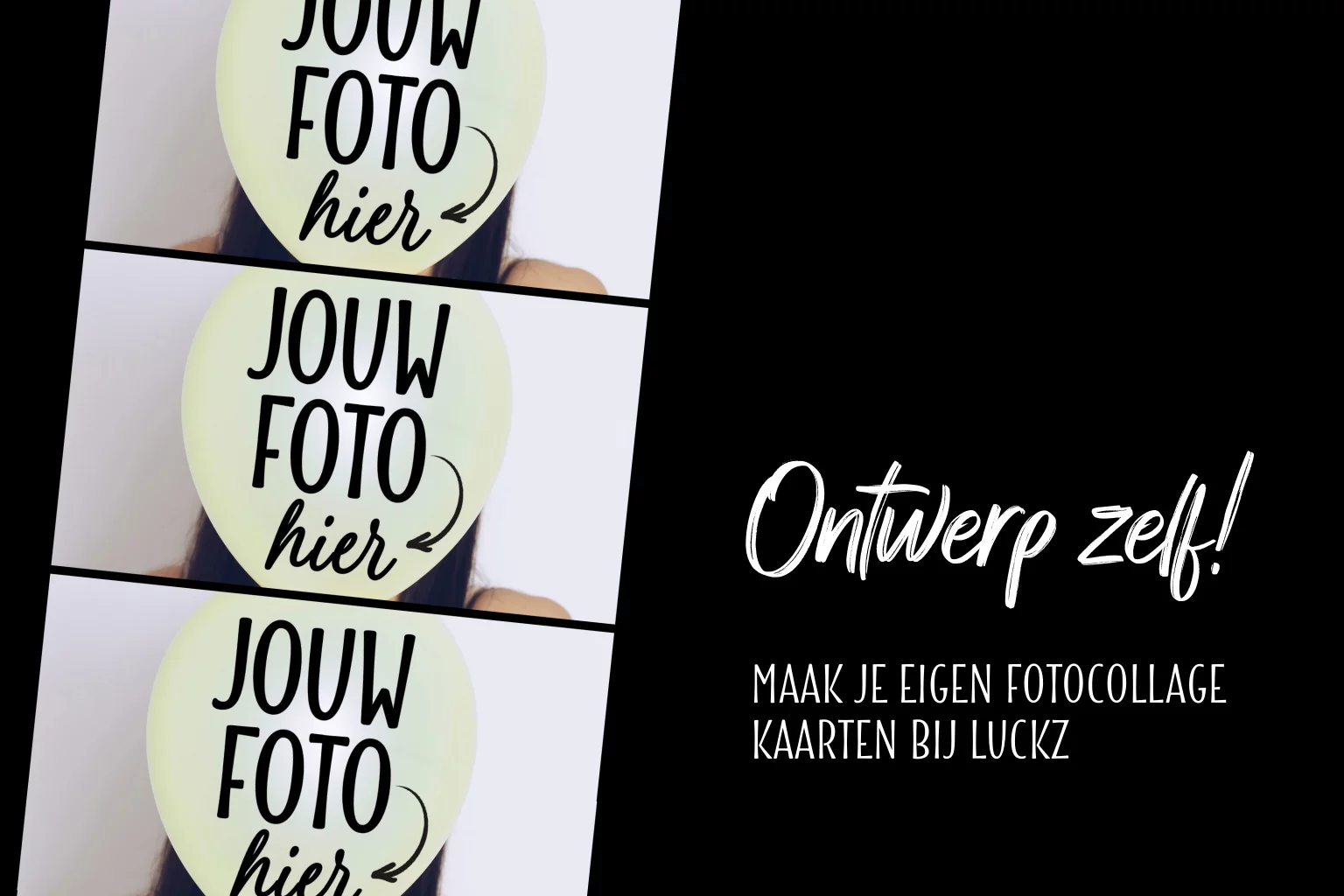 Mooi zwart fotokaartje met een collage van 3 foto's in een schuine foto strip. Schrijf daarna een leuke tekst en een groet en je persoonlijke fotokaartje is klaar.