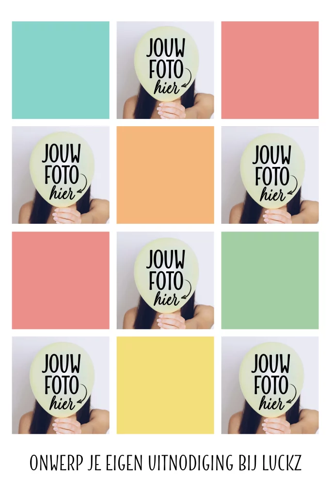Maak zelf deze leuke collage kaart uitnodiging met 6 eigen foto's en 6 vrolijke kleuren online bij Luckz. Een dubbele staande fotokaart met 12 vierkantjes waarin je je eigen foto's kunt uploaden.