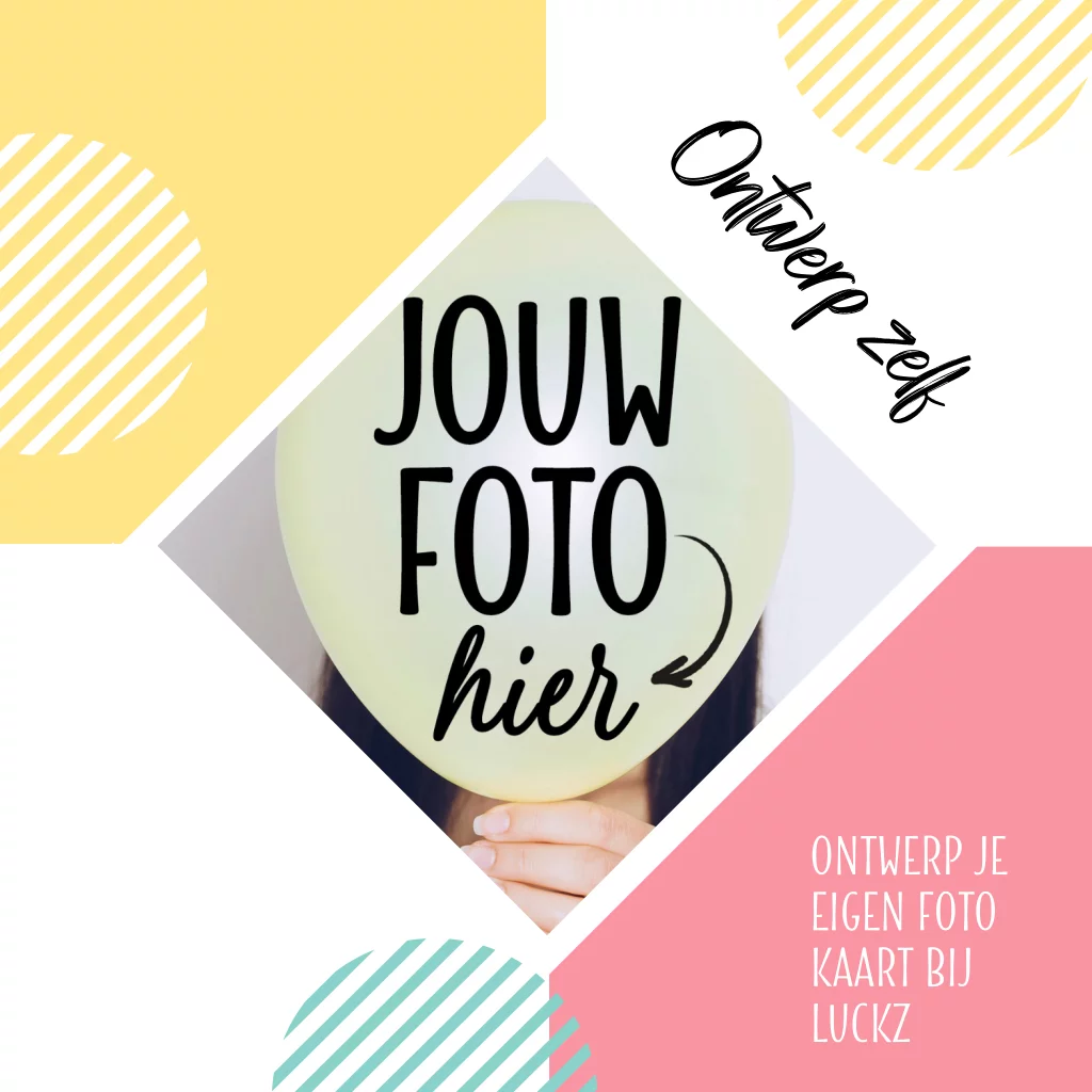 De vrolijke roze, blauwe en gele kleur kleurvlakken en gestreepte cirkels kun je zelf aanpassen naar iedere gewenste kleur. Ga creatief aan de slag en maak je eigen leuke uitnodiging met jouw foto op de voorkant.