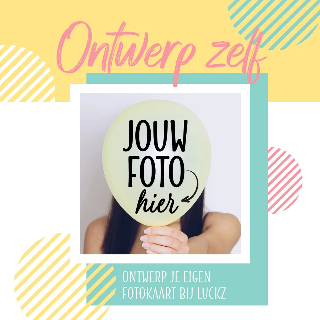 Snel en eenvoudig je eigen vrolijke kaart met foto ontwerpen en bestellen. Het sjabloon van de kaart is alvast klaargezet met hippe kleuren en streepjes bollen.